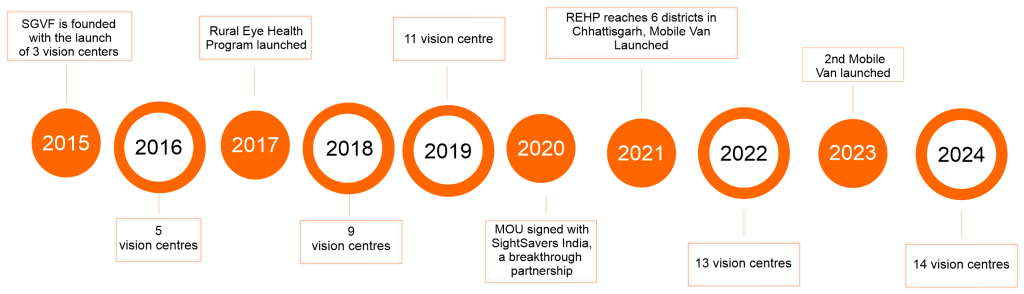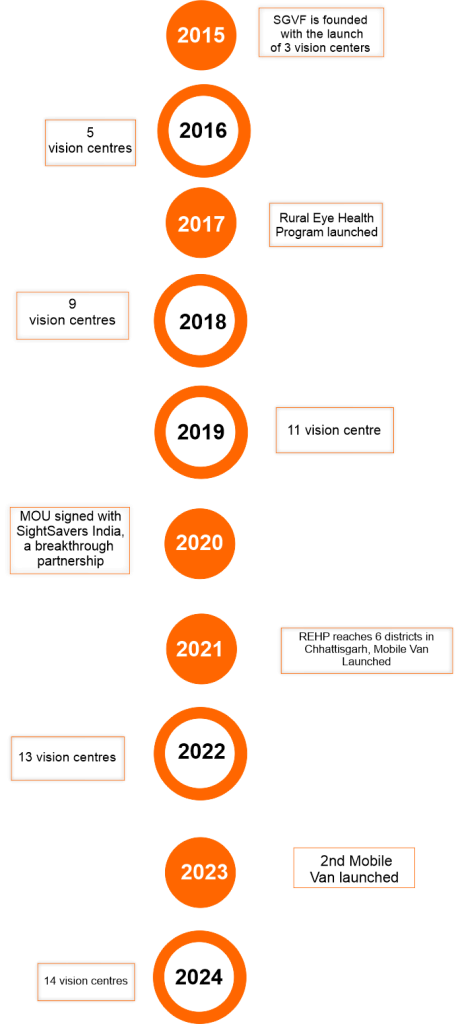 Our primary objective is to eradicate preventable blindness from central India through our network of 19 vision centers, three secondary-level eye hospitals, and a tertiary-level eye hospital. Currently, we operate in 12 districts of Chhattisgarh. Since our inception in 2015, we have positively impacted approximately 200,000 individuals, including over 11,000 children, by providing them with the awareness, screenings, and eye care services they deserve. In 2023 alone, we provided eye care to 83,463 individuals suffering from eye diseases, distributed 5,073 free spectacles, and performed 4,493 free cataract surgeries. Additionally, we extended our services to 17,873 truck drivers, providing 7,589 free spectacles in collaboration with our esteemed partner, Sightsavers India.